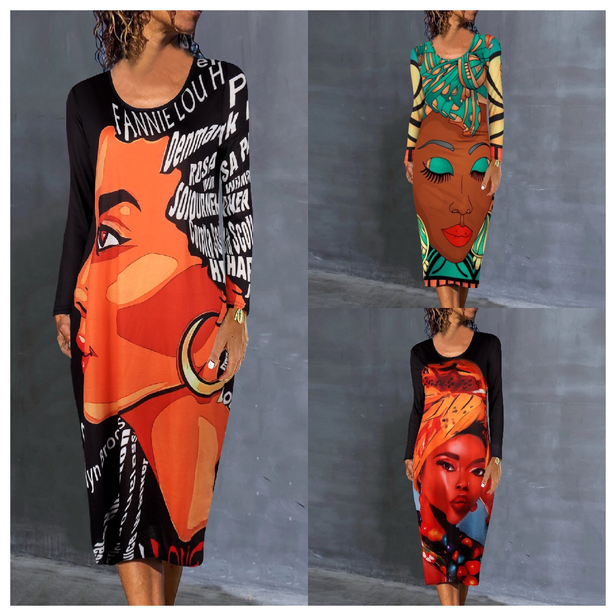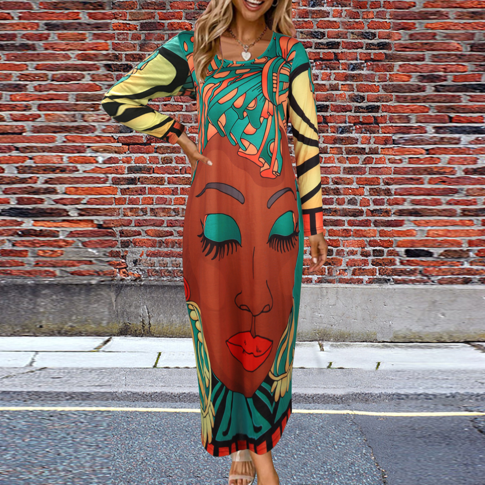 Casual Fashion Human Color Block Round Neck Long Sleeve Printing Polyester Maxi Long Dress Straight Skirt