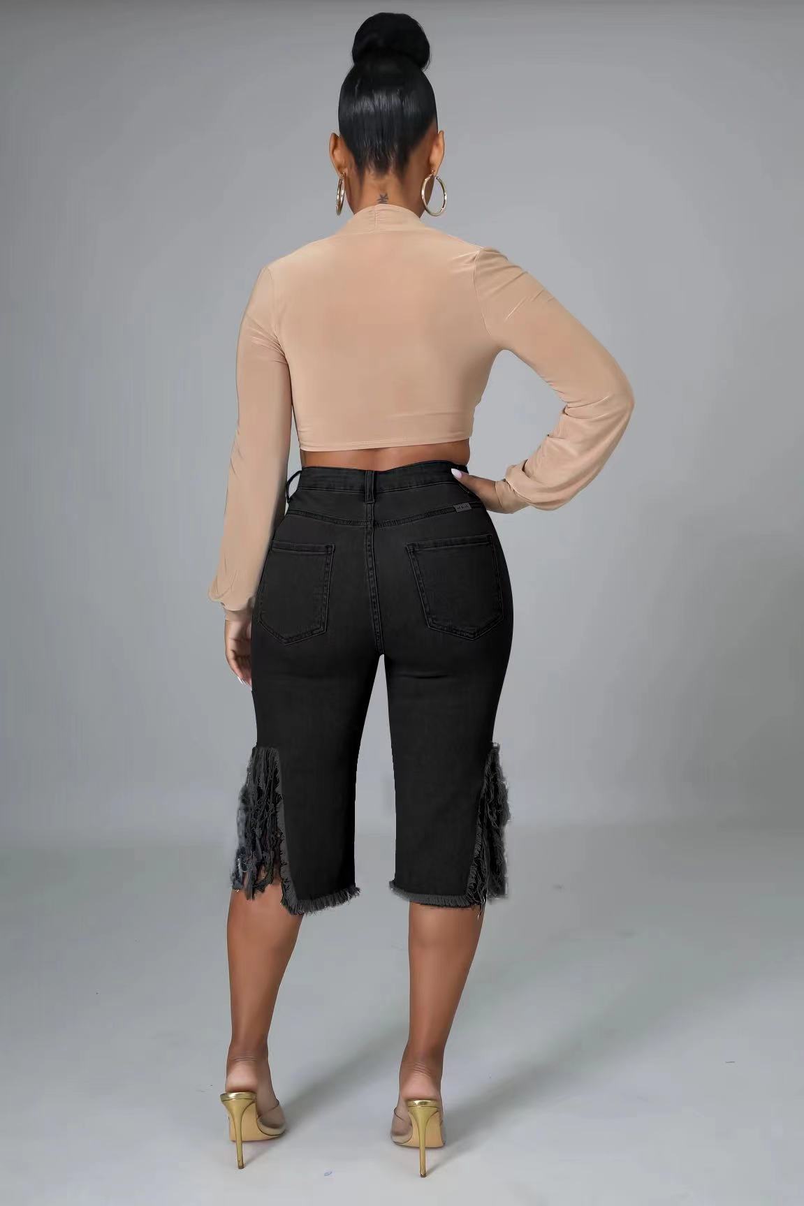 high waist fringed hole stretch capri jeans